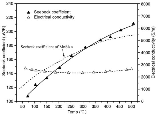 Figure 9. The measured Seebeck coefficient and electrical conductivity of plasma sprayed HMS coating from 50 °C to 500 °C.