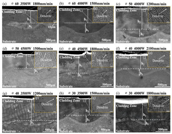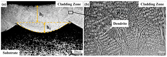 Figure 4 shows the results after cladding. The dilution ratio is calculated by the formula in Equation (3)