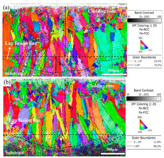 Table 8). This finding suggests that high-angle grain boundaries can effectively hinder dislocation movement, thereby increasing the material’s hardness. Additionally, for large-diameter (>50 mm) substrates under high energy density conditions, the cooling rate of the molten pool decreases from 10