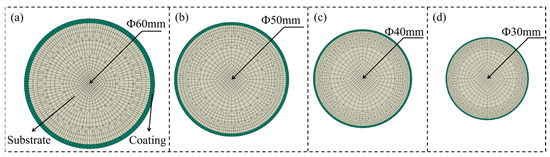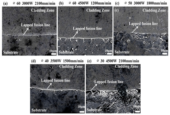 To maintain comparable thermal cycles and process stability across different substrate sizes, the energy density range was proportionally adjusted in the experimental design. For large-diameter substrates (50–60 mm), lower energy densities (1.43–2.67 J/mm2) were employed to prevent excessive heat accumulation and substrate overmelting. Conversely, higher energy densities (1.91–2.92 J/mm2) were applied to smaller-diameter substrates (30–40 mm) to counteract rapid heat dissipation effects and ensure sufficient metallurgical bonding. In this study, the laser spot diameter was fixed at 5 mm.