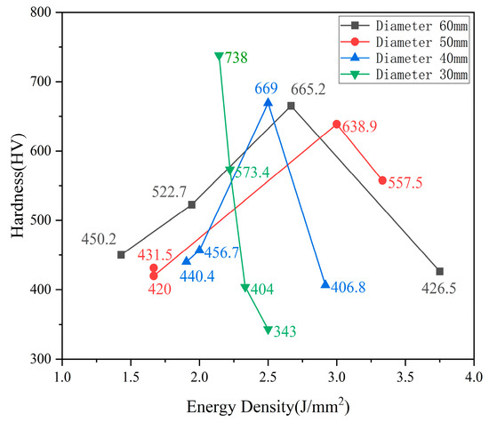 Figure 11 can be attributed to the complex interplay of thermal diffusion dynamics and molten pool evolution mechanisms. When substrate diameter exceeds the critical threshold of 50 mm, the thermal diffusion time constant τ undergoes a nonlinear increase from 18.6 s to 26.8 s (46% increment), fundamentally altering the heat dissipation pathways. This extended thermal diffusion path creates a bifurcation in the hardness–energy density relationship: at moderate energy densities (1.43–2.14 J/mm
