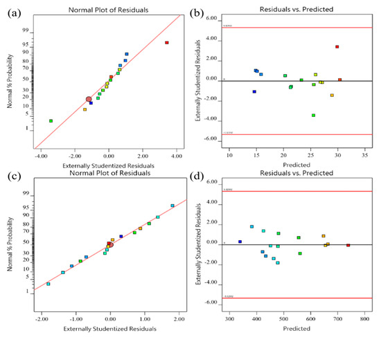Figure 12a,c displays the residuals’ normal probability plots; the closer the plotted points align with the straight line, the more favorable the result. It is evident that most of the scattered points in the graph are almost on the straight line, and overall, they are highly attached to both sides of the line, indicating that the regression model has small residuals and good precision overall.