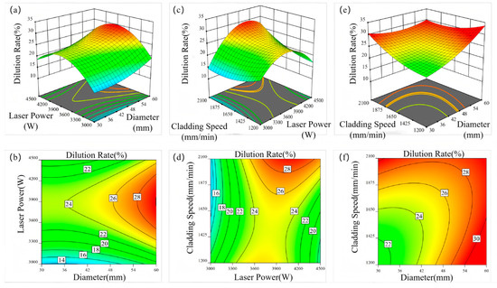 Figure 13c,d. The surface features are distinct. The dilution rate is lowest when both diameter and cladding speed are at their minimum levels, at which point it is below 22%. From the contour map, it can be seen that starting from the origin of a diameter of 30 mm and a cladding speed of 1200 mm/min, the dilution rate increases gradually in all directions. The dilution rate rises most quickly along the diameter axis and can reach the highest value. When the diameter reaches 60 mm, the dilution rate can exceed 30%. Therefore, it can be concluded that when both diameter and cladding speed are at relatively low levels, it is not conducive to dilution. Thus, in future experiments, to achieve a higher dilution rate, it is advisable to avoid values for both factors that are at low levels or near-low levels.