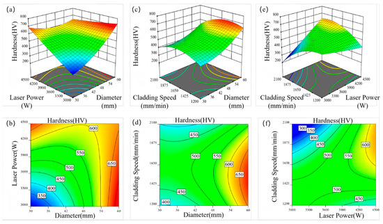 Figure 14a that the highest and lowest points of the surface are distinct. The hardness is lowest when both diameter and laser power are at their minimum levels, at which point it is less than 350 HV. However, the hardness can exceed 700 HV when the diameter reaches 60 mm and the laser power is not higher than 3600 W. A hardness range of 500–600 HV is considered ideal. According to the contour plot (b), an ideal hardness can be achieved when the diameter is between 48–54 mm across the entire range of laser power, or when the diameter is less than 48 mm and the laser power is between 3800 W and 4200 W. In terms of significance, the dilution rate increases monotonically with increasing diameter and laser power. However, there is a clear difference in the range of dilution rate changes within the entire range of the two factors. The range of hardness values within the levels of diameter and laser power is (300–650) and (300–750), respectively. Therefore, it can be concluded that diameter has a greater impact on hardness.