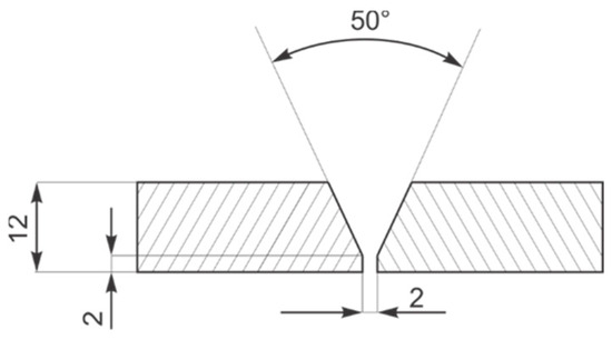 For the purposes of this study, welding of S1100QL had to be conducted; since SSAB’s STRENX 1100 E/F was used in this study, all the producer’s available literature was consulted. For successful welding of STRENX 1100 E/F, SSAB recommends two different technologies, with and without preheating [19,20]. SSAB also gives recommendations regarding the heat input and filler materials that are used for both technologies. Four plates with dimensions of 200 mm × 500 mm × 12 mm were prepared, with the idea that two of them will obtain two welded joints where each technology will be applied. The plates were prepared and beveled for a V-butt joint. The prepared geometry is displayed in Figure 1, and recommendations regarding welding technology are displayed in Table 3 and Table 4.