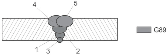 According to the steel producer, for further welding of the prepared groove, the G 18 8 Mn filler material was changed to G89 grade. For these welds, a robotic console was used. For this purpose, the authors chose ESAB’s ARISTOROD 89. This filler material complies with the producer’s recommendations, and it is similar to the base material with slightly lower strength. Chemical composition, mechanical properties, and recommended welding parameters are displayed in Table 8, Table 9 and Table 10. The scheme of the deployed welds is presented in Figure 5, and the welding parameters for each pass are shown in Table 11 [23].