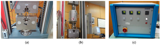 (a) Universal testing machine; (b) Maytec heating chamber; (c) control unit.