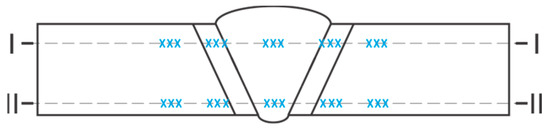 Technology B is the alternative technology recommended by the steel producer. According to the producer’s recommendations, this technology included preheating the prepared plates, up to temperatures of 200 °C, and an application of just one filler material, G89 (ESAB, North Bethesda, MD, USA). The recommendations regarding heat input are the same as in the first case, between 8 and 12 kJ/cm. The chemical composition, mechanical properties, and recommended welding parameters of the filler material used were previously displayed. Before welding was initiated, the plates were joined through several small tack welds, the same as displayed in the figure. After tack welds were deployed, preheating of the plates intended for technology B began. Preheating was completed using a liquid petroleum gas (LPG) torch. The selected preheating temperature was 175 °C, and it measured 100 mm from the position of the welded joint. The interpass temperature was also 175 °C. The scheme of deployed welds is displayed in Figure 6, and the parameters used are displayed in Table 12.