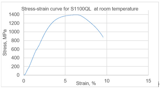 For the purposes of this study on S1100QL, SSAB’s STRENX 1100 E/F [19,20] was used for preparing specimens for both investigation of its tensile properties at room and elevated temperatures and for preparation of plates intended to be welded in the future, so that investigation of the welded joints’ tensile and other properties could be conducted. As mentioned before, this steel belongs to the group of UHSS. Its mechanical properties and chemical composition declared by the producer are presented in Table 1 and Table 2.