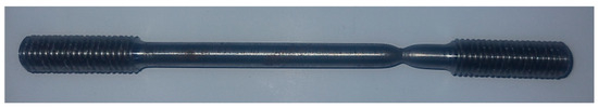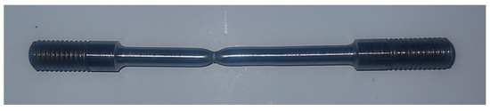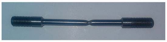 Specimens for tensile testing of welded joints were also CNC machined on a lathe, with similar geometry but different dimensions. In this case, the dimensions were altered to assure the quality of the thread, as its quality is important for connecting specimens with the testing machine. A sketch of the specimen’s geometry and a photo of a finished specimen are presented in Figure 8.