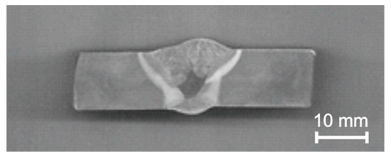 A macrostructure view of a cross-section of a Technology A welded joint made of S1100QL steel with a thickness of 12 mm is presented in Figure 26. The joint was made in five passes, where the root of the weld was formed with a lower heat input (8 kJ/cm), while the other passes were realized with an energy of 10 kJ/cm, which achieved good filling and bonding of the layers.