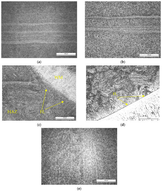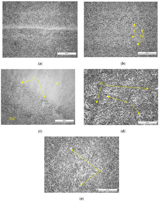 In Figure 25e, the microstructure of the weld metal is displayed. In the figure, coarse lath-like martensite with carbide precipitates can be clearly observed. Due to fast cooling and solidification, a coarse lath shape is obtained, worsening the mechanical properties of the joint.