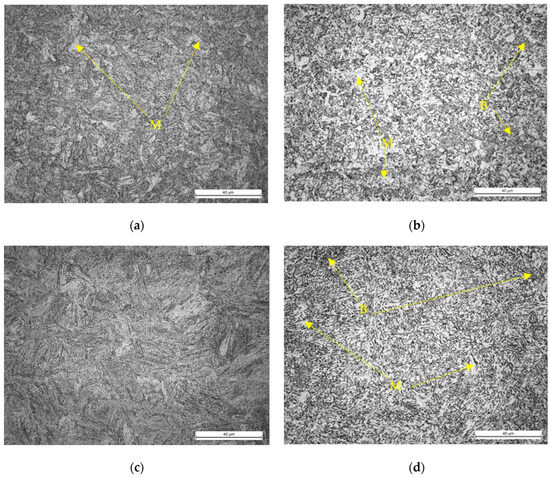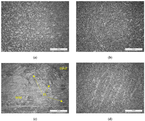 The structure presented in Figure 28d was observed in the weld metal. A coarse martensite structure with a small portion of bainite islands is observed. Compared to the first structure, in this case, the grains are finer; thus, better properties are expected in this case.