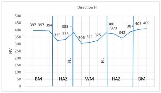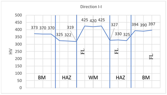 Hardness distribution throughout direction I-I on the technology B welded joint.