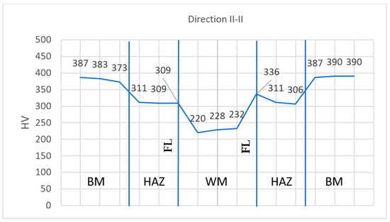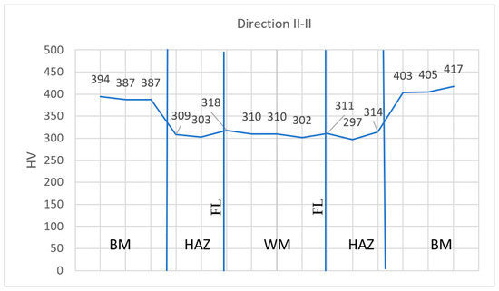 Hardness distribution throughout direction II-II on the Technology B welded joint.