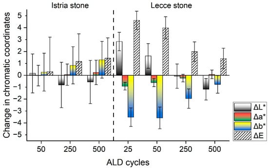 Average change in chromatic coordinates (specular component included) of Istria stone and Lecce stone from applying varying cycles of ALD alumina.