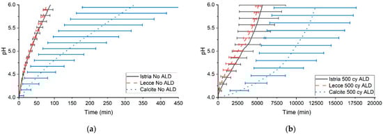 To characterize how well the ALD alumina coatings protect Istria stone, Lecce stone, and single-crystal calcite from acid attack, “No ALD-samples” and “500-cycles ALD-samples” were immersed in aqueous solutions of acetic acid with a starting pH of 4 while stirring. The results of the No-ALD samples are shown in Figure 2a, and the results of 500-cycle ALD samples are shown in Figure 2b. In the absence of the coating, the pH evolution is sublinear with time owing to the decreasing etch rate with pH in the range ~4 to ~5.5 []. Notably, the time scale of Figure 2b is much longer than Figure 2a due to the protection provided by the ALD coating. However, the sign of the curvature of the pH vs. time dependence seemingly changes at a certain point for the coated films, indicating a change from sublinear to superlinear evolution of the calcite mass loss with time, perhaps due to the competition between the slowing effect of the changing pH, and the increasing of the exposed effective area, which we discuss in more detail below.