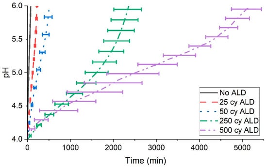 3.3. pH Evolution to Measure Effect of ALD Thickness