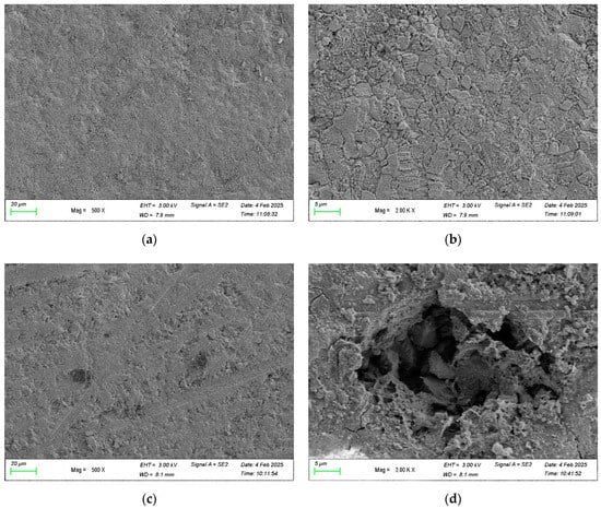 SEM micrographs showing the morphology of Istria stone after acid immersion. (a) No ALD; (b) No ALD; (c) 500-cycle ALD; (d) 500-cycle ALD.