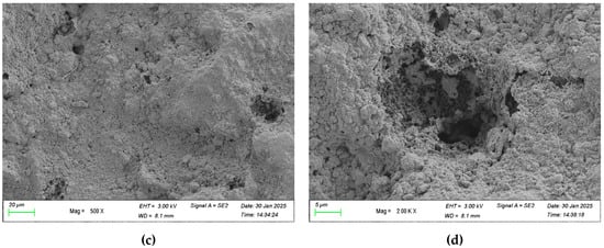 SEM micrographs showing the morphology of Lecce stone after acid immersion. (a) No ALD; (b) No ALD; (c) 500-cycle ALD; (d) 500-cycle ALD.