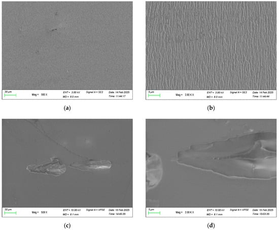 Examination of the SEM micrographs reveals that the topography produced by acid immersion is far more heterogeneous for the ALD alumina-coated objects due to the local formation of etch pits in each case. For all types of ALD alumina-coated samples, Istria, Lecce, and calcite, surface pitting was observed after immersion in acetic acid. As previously reported for Istria stone [] and shown in Figure 4c,d, the ALD-coated calcium carbonate grains outside of the pitted regions did not visibly round during acid exposure. This is in contrast to the No-ALD sample calcium carbonate grains, which did visibly round during acid exposure (Figure 4a,b). Similar results are found for the Lecce stone (Figure 5), suggesting that the unpitted regions remained protected by the ALD coating, while the acid was able to penetrate and react with the underlying stone in the pitted regions. Examining the uncoated calcite reveals clearly visible step bunch trains resulting from etching, consistent, for example, with a slight misorientation with respect to a close-packed plane [,], and that cover the entire surface after acid immersion (Figure 6a,b). These etching-related artifacts are not found on the surface of the ALD-coated calcite samples away from isolated pits (Figure 6c,d).