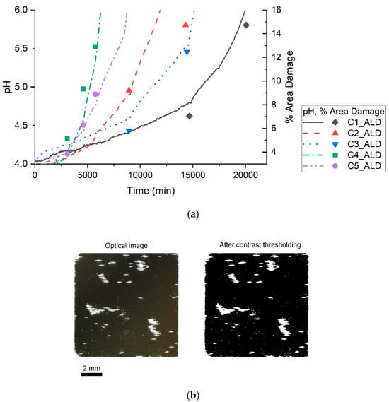 (a) pH evolution of acetic acid solution for immersion of the 500-cycle ALD calcite samples. A total of 5 calcite ALD samples were measured. Each line represents one sample labeled C1,2,3…_ALD. (b) Example of one of the optical images transformed into binary coloring, which is used to calculate the percent area damage. Optical image corresponds to C3_ALD at time 8921 min.