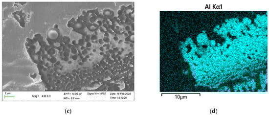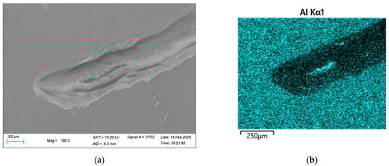 Morphological characteristics and the presence and distribution of aluminum for various samples were measured with a Zeiss Gemini 300 Scanning Electron Microscope (SEM) (Zeiss, Oberkochen, Germany) equipped with an Oxford Ultim max 170 Energy Dispersive Spectroscopy (EDS) detector (Oxford Instruments, Abingdon, England). To mitigate surface charging of the insulating samples without applying a conductive coating, a low working voltage of 3 keV was used to image most samples. Alternatively, some samples were imaged in variable pressure mode at 0.2 Torr with a working voltage of 10 keV. EDS scans were taken in variable pressure mode at 0.2 Torr with a working voltage of 10 keV.