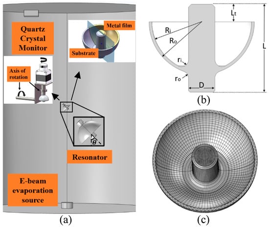 (a) Spatial distribution of the Crystal Oscillator Monitor, resonator, and E-beam evaporation source. (b) Cross-sectional view of the resonator and important geometrical parameters of the shell. (c) Mesh configuration of the resonator.