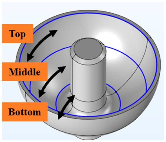 The coating areas include the inner surface of the shell and the stem. The simulation results indicate that the vast majority of elastic energy (98.65%) is stored in the shell, while only a minimal portion (1.35%) is retained in the stem [21]. Therefore, film thickness uniformity is a critical factor in the region of the shell, because poor uniformity may lead to increased energy losses. The stem region requires a sufficiently thick film to ensure conductivity rather than uniformity.