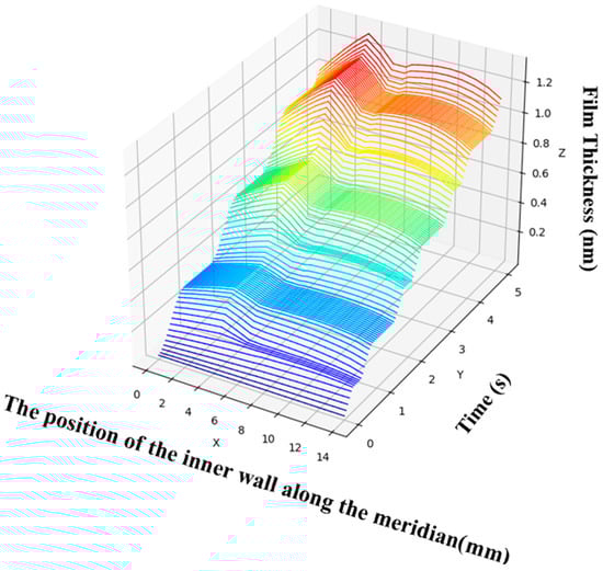 The variation in film thickness along the meridional direction of the inner shell of the resonator from 0 s to 5 s when the deposition angle is 45 degrees.