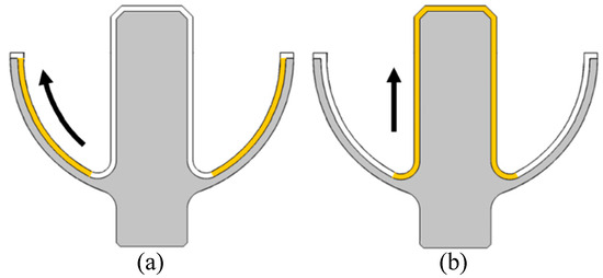 (a) Distribution direction of film thickness on the inner shell surface. (b) Distribution direction of film thickness on the stem surface.