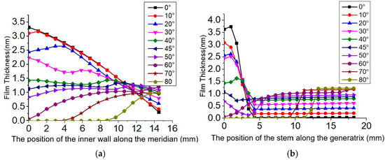 (a) The distribution of film thickness on the shell along the meridian at different deposition angles. (b) The distribution of film thickness on the stem along the generatrix at different deposition angles.