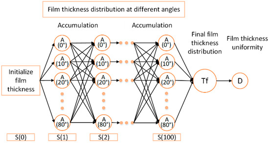 For the task discussed in this paper, it is necessary to define the state and action spaces, in addition to designing the reward function. The “state” represents all the observational information about the environment available to the agent. In this task, the initial state is defined as a film thickness of zero. After each action taken by the agent—selecting a film thickness distribution at a particular angle—the agent observes the accumulated film thickness at the next time step, denoted as S(t). The “action” refers to the agent’s decision based on the current state. Specifically, the agent selects one of ten possible thickness distributions from different perspectives for the subsequent cumulative calculation, as shown in Figure 10. The agent selects a thickness distribution from the ten available options by sampling from the probability distribution output by the Actor network. During training, this sampling encourages exploration, while during evaluation, the highest-probability action is chosen. The probabilities are optimized via PPO’s clipped objective to maximize the reward function (Equation (4)), which penalizes peak-to-valley variations. No explicit cost function is used; the selection is learned end-to-end through policy gradients. In addition, the PPO model ensures escape from suboptimal solutions by continuously exploring the action space during training, while its stochastic policy updates facilitate progressive convergence toward the global minimum, thereby inherently avoiding local minima.