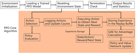 The training process of the algorithm consists of data collection and policy optimization. For data collection, during each episode, the agent selects coating angles based on the current policy. The environment then performs accumulation and returns the new state and reward. The experience tuples (state, action, reward, next state, done) are stored in the replay buffer. For policy optimization, at the end of each episode, the learn method is invoked to compute the Generalized Advantage Estimation (GAE), normalize the rewards, and update the policy network using the Clipped Surrogate Objective to ensure the update magnitude does not exceed ε. Additionally, the Critic network is updated by minimizing the value function error (MSE). The process terminates once the maximum accumulation count is reached [27]. As shown in Figure 11, the core algorithm flow of PPO is illustrated. Table 3 presents the key parameters of the PPO algorithm along with their descriptions.