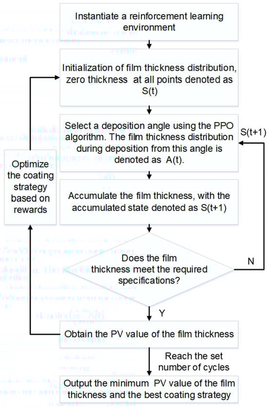 Proximal Policy Optimization (PPO) is a reinforcement learning (RL) algorithm for training an intelligent agent’s decision function to accomplish difficult tasks. When PPO is applied to discrete action spaces, the policy network it uses is typically a neural network that outputs a probability distribution over all possible actions. Specifically, in a discrete action space, PPO selects an action at each time step based on the current policy, with the action sampled according to the probability distribution generated by the policy network. The core idea of the algorithm is updating the policy through gradient descent, increasing the probability of selecting actions that yield higher rewards, thereby gradually improving the overall performance of the agent [22,23,24]. The PPO algorithm demonstrates distinct advantages over other optimization methods. Unlike genetic algorithms (GAs) that rely on random crossover/mutation operations—which may disrupt high-performance sequences—PPO strategically prioritizes exploration in high-reward regions. Compared with grid search methods, PPO avoids the prohibitive computational costs associated with fine-grained angle and timestep discretization in high-dimensional spaces. Crucially, PPO’s inherent suitability for continuous, high-dimensional, and dynamically interactive environments makes it the optimal choice for future multi-degree-of-freedom system development. This includes enhancements such as integrating Planetary Rotation Systems and improving yaw-angle precision—capabilities where GAs fundamentally underperform. The advantages of these algorithms indicate that PPO is a superior choice for coating optimization [25,26].