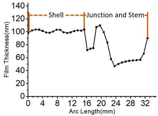 Figure 14 presents the thickness distribution of the shell and stem obtained through COMSOL using the optimized coating process. The X-axis denotes the position (in mm) in the inner wall along the meridian, extending from the edge of the shell, passing through the junction, to the stem termination. The Y-axis represents the deposited film thickness (in nm). The film thickness data in the shell section are as follows (in nanometers): 98.33, 102.25, 103.61, 103.51, 101.51, 99.26, 98.68, 100.65, 103.37, 103.16, 99.45, 98.31, 99.38, 101.36, 102.47, 101.99. The film thickness uniformity was determined to be 5.24% according to Equation (3). This result demonstrates the effectiveness of the finite element method combined with reinforcement learning algorithms in improving film uniformity. However, as shown in Figure 15, another key issue arises: while the optimized process improves the film uniformity on the shell, it results in thinner films in other areas, which lead to an increase in the resistance of the entire hemispherical resonator. The film thickness data in the junction and stem are as follows (in nanometers): 103.21, 71.95, 74.11, 75.56, 107.23, 109.36, 99.52, 83.68, 58.76, 46.78, 50.33, 53.24, 54.37, 55.33, 55.95, 56.35, 56.61, 66.52, 90.41. This paper addresses this issue by using a correction mask.