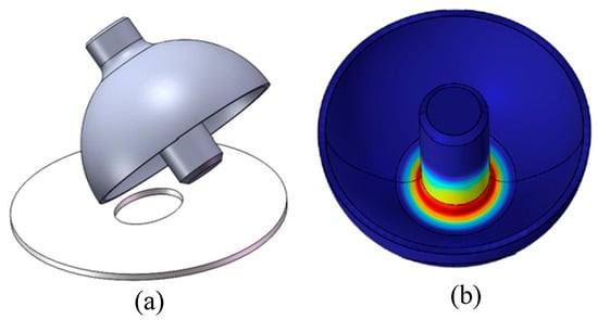 where and are the major axis and minor axis of the elliptical hollow, is the diameter of the evaporation source, is the diameter of the junction, is the distance from the evaporation source to the resonator, and is the distance from the evaporation source to the mask. The major axis of the elliptical hollow is 11.5 mm, and the minor axis is 8.5 mm. The designed correction mask is applied in the simulation of the coating process, with the results displayed in Figure 17. After the installation of the correction plate, the film is deposited only at the junction and stem, with no deposition on the shell. The feasibility of the correction mask was confirmed through simulation verification, followed by its production, which to some extent ensured its effectiveness and practicality while saving both time and cost.