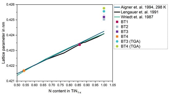 - Lengauer, W. Properties of bulk δ-TiN1−x prepared by nitrogen diffusion into titanium metal. J. Alloys Compd. 1992, 186, 293–307. [Google Scholar] [CrossRef]