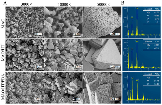 Surface morphologies (A) and EDS results (B) of MAO, MAO/HT, and MAO/HT/PDA coatings.