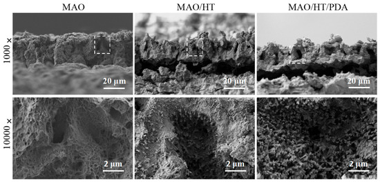 Cross morphologies of MAO, MAO/HT, and MAO/HT/PDA coatings, 10,000× images are enlarged views of the dashed box in corresponding 1000× images.