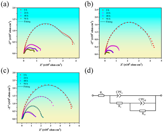 Nyquist plots of the MAO (a), MAO/HT (b), and MAO/HT/PDA (c) samples in SBF for different immersion times; (d) equivalent circuit for fitting impedance data.