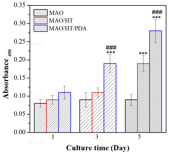 The MTT assay is employed to determine cell viability and proliferation on MAO, MAO/HT, and MAO/HT/PDA samples. Figure 8 shows the resulting MTT results of MC3T3-E1 cells incubated on different samples for 1, 3, and 5 days. Generally, all the samples can support cell proliferation throughout the whole culture period. However, the obtained cell quantity derived from MTT results were in the following order: MAO < MAO/HT < MAO/HT/PDA at each measurement time point, confirming that MAO/HT/PDA coating exhibits better cytocompatibility than MAO and MAO/HT coatings.