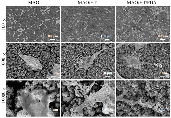 Morphologies of MC3T3-E1 after cultured on MAO, MAO/HT, and MAO/HT/PDA coatings for 2 days. The high-resolution images represent the amplification of the dotted area in the corresponding low resolution images.