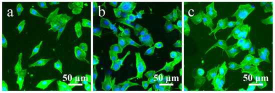 Fluorescence images of MC3T3-E1 cells for actin (green) and nucleus (blue) after 48 h of culture on MAO (a), MAO/HT, (b) and MAO/HT/PDA (c).