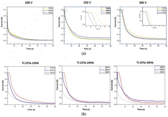 Current curves as a function of time during the MAO process under different experimental conditions: (a) variation in the Nb content at a constant voltage (upper graphs) and (b) variation in the voltage (200, 250, and 300 V) with the Nb content kept constant (lower graphs).