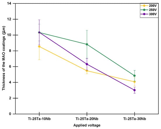 Analysis of Figure 4 shows that, except for the samples produced at 300 V, the Ti-25Ta-10Nb alloy has the lowest oxide coating thickness values. However, returning to some of the discussions regarding the graphs in Figure 2a, it is clear that the sample with 10% by weight of Nb subjected to voltages of 250 and 300 V remained in the galvanostatic regime for a longer period, which is the main factor responsible for the formation of the coating. This behavior may be linked to changes in the crystal structure. According to Rossi et al. [] and other researchers, the addition of Nb tends to increase the number of defects in the crystal lattice, favoring a greater incidence of localized electric arcs, which can lead to an increase in the thickness of the oxide layer.