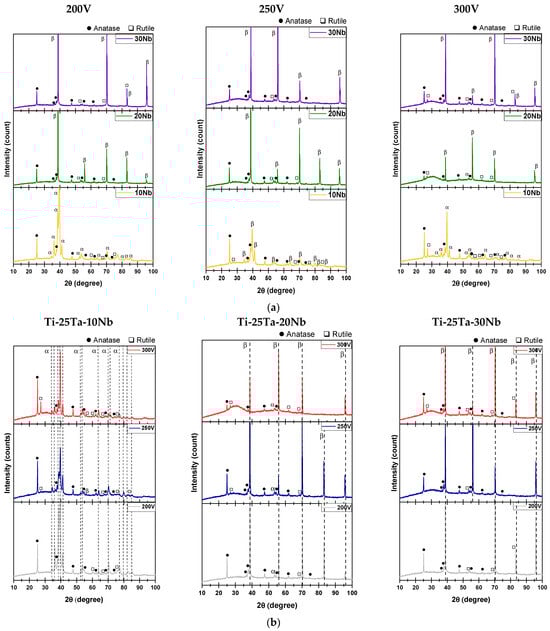 XRD patterns of the oxide layers produced by MAO, based on different analyses: (a) variation in Nb content (upper graphs) and (b) variation in voltage (200, 250, and 300 V) (lower graphs).