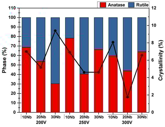 Figure 6 also shows that the applied voltage influences phase formation. For the samples treated at 200 V, a reduction in the proportion of anatase and an increase in the amount of rutile is observed with the addition of Nb.