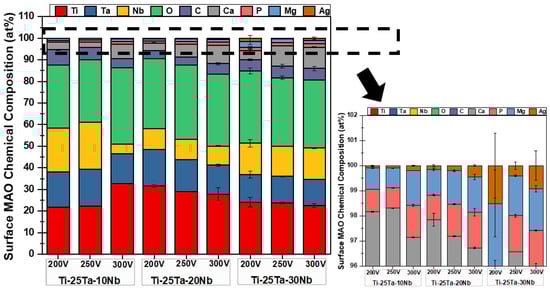 The quantifications of the elements obtained by SEM-EDS analysis are shown in Figure 7. The results indicate that all the samples are composed of the alloying elements (Ti, Ta, and Nb) and the elements present in the electrolyte (Ca, P, Mg, and Ag). Carbon (C) was also identified, having been incorporated into the oxide coating from calcium acetate, disodium glycerophosphate, and magnesium acetate. This result corroborates the data obtained from the XRD profiles, in which characteristic peaks of TiO2 were observed in the anatase and rutile crystalline phases.