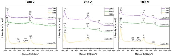 Raman spectra of the samples produced by MAO under different voltages (200, 250, and 300 V) and different Nb compositions.
